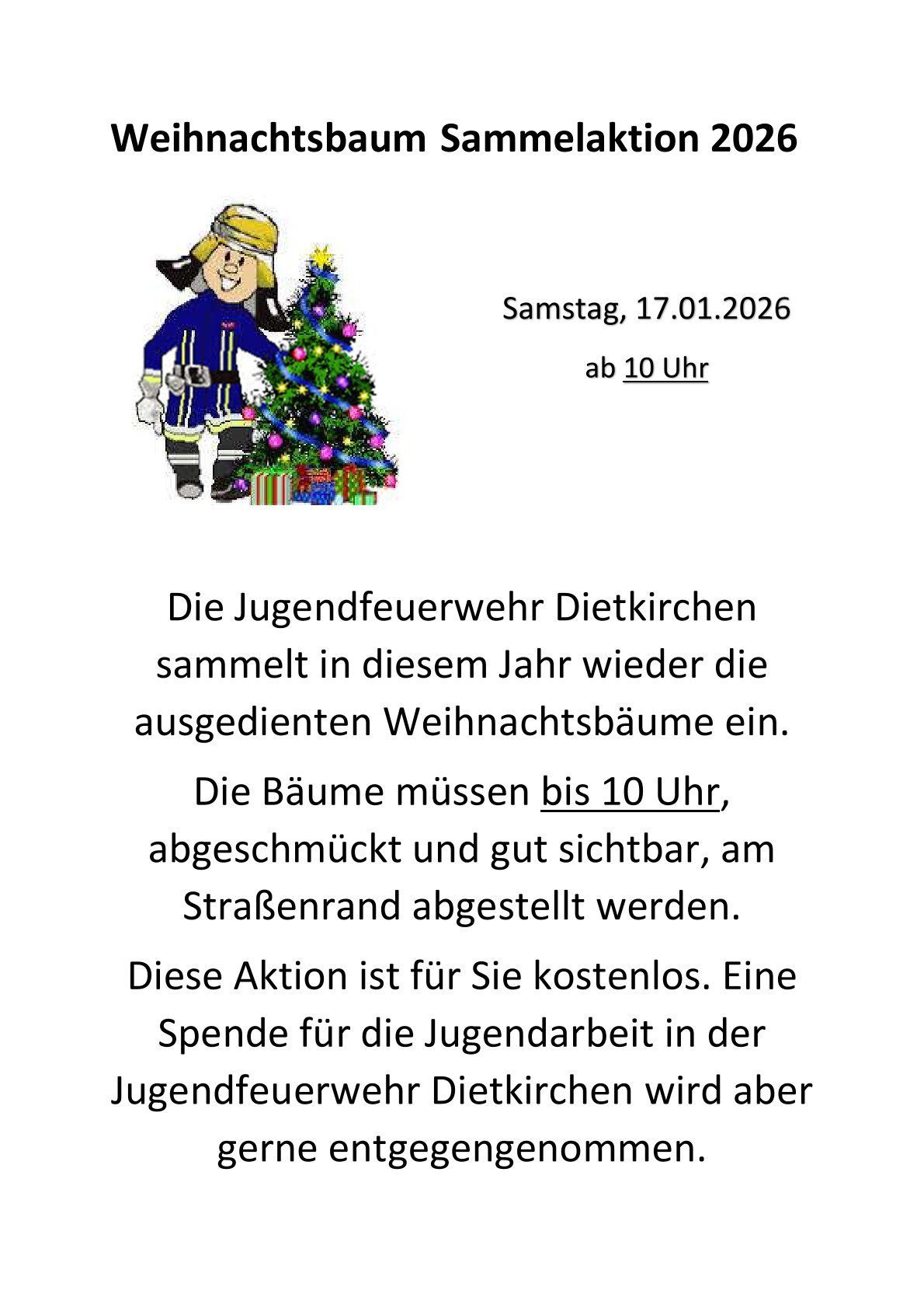 ++ Am 17.Januar 2026 ab 10 Uhr sammeln wir im Stadtteil Dietkirchen die ausgedienten Weihnachtsbäume ein ++